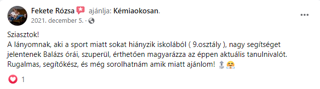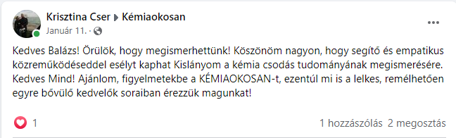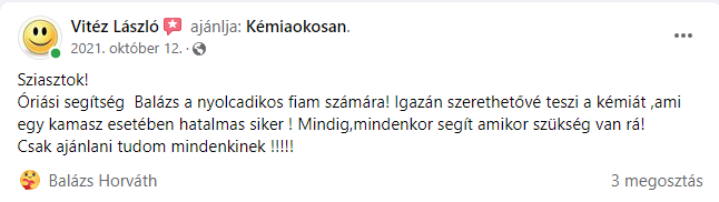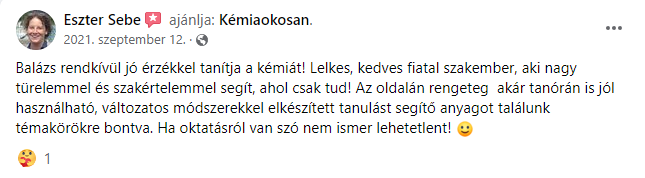 3. “Balázs igazán tehetséges, jó kommunikációs készségekkel rendelkezik. Megbízható és kitűnő a szakmai tudása. Érthetően magyaráz, mindenben segítőkész. Vele a kémia tanulása egyszerű és érdekes. Nagyszerű tanár és barát is egyben.”