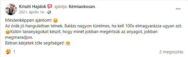 1. Mindenkinek szívből ajánlom a feltöltött oktató anyagokat és tanácsokat. Sokat és könnyen lehet belőle tanulni. A közös munka során Balázs tényleg mindent a legegyszerűbb napi példákkal érthetően magyarázott el. Tudom ajánlani annak aki úgy érzi problémája van és szeretne fejlődni a kémia világában.